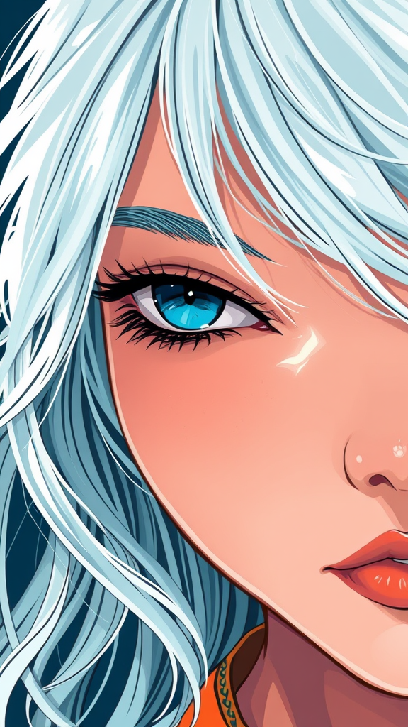 A close-up illustration of a girl with striking white hair, infused with a color palette of light teal and dark orange. The artwork blends the vibrant, fluid style of Ross Tran with the detailed realism of marine paintings reminiscent of Guido van Helten. The scene captures the expressive qualities of comic art, infused with animated elements that bring subtle motion, reminiscent of animated gifs. The composition balances stylized aesthetics with realistic textures to create a harmonious and captivating visual narrative.