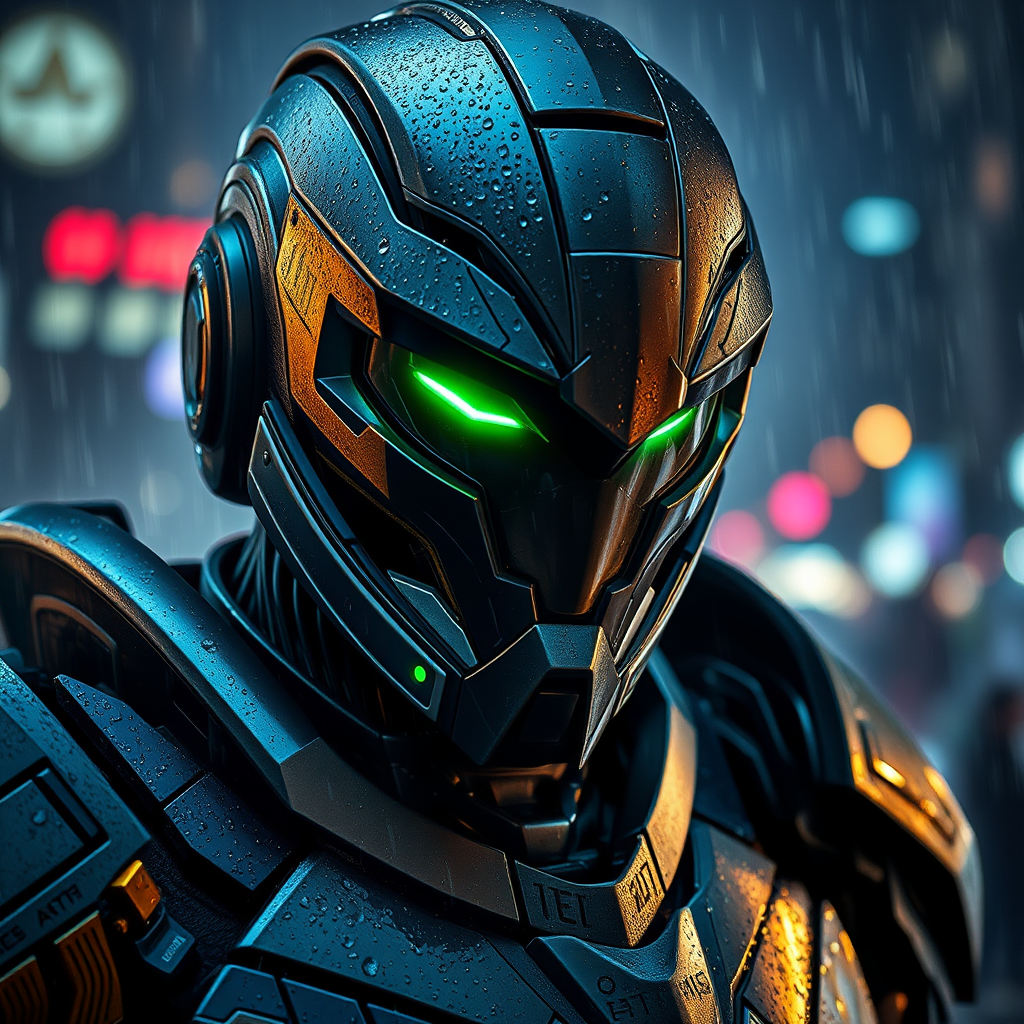 A close-up image depicts a humanoid figure, possibly a robot or a person, encased in a cutting-edge suit of armor. This armor features a sleek design with blue and gold accents against a predominantly dark graphite and silver base. The scene captures a rainy atmosphere, with water droplets cascading across the armor's surface. The helmet's luminescent green, visor-like eyes lend the subject an intensely focused appearance. In the misty background, the dim, colorful glow of city lights hints at a bustling urban nightscape. The intricately detailed armor showcases advanced technological lines and patterns, suggesting both strength and agility.