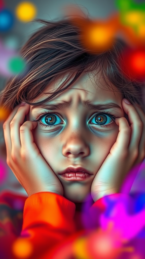 A close-up image of a concerned young girl with tousled hair, her hands resting on her temples as she gazes into the distance, surrounded by a palette of vivid digital colors. Her eyes are filled with uncertainty, reflecting a mix of emotions, while the background softly blurs into an abstract blend of vibrant hues. The scene captures a moment of deep contemplation, enhanced by the play of light and color around her.