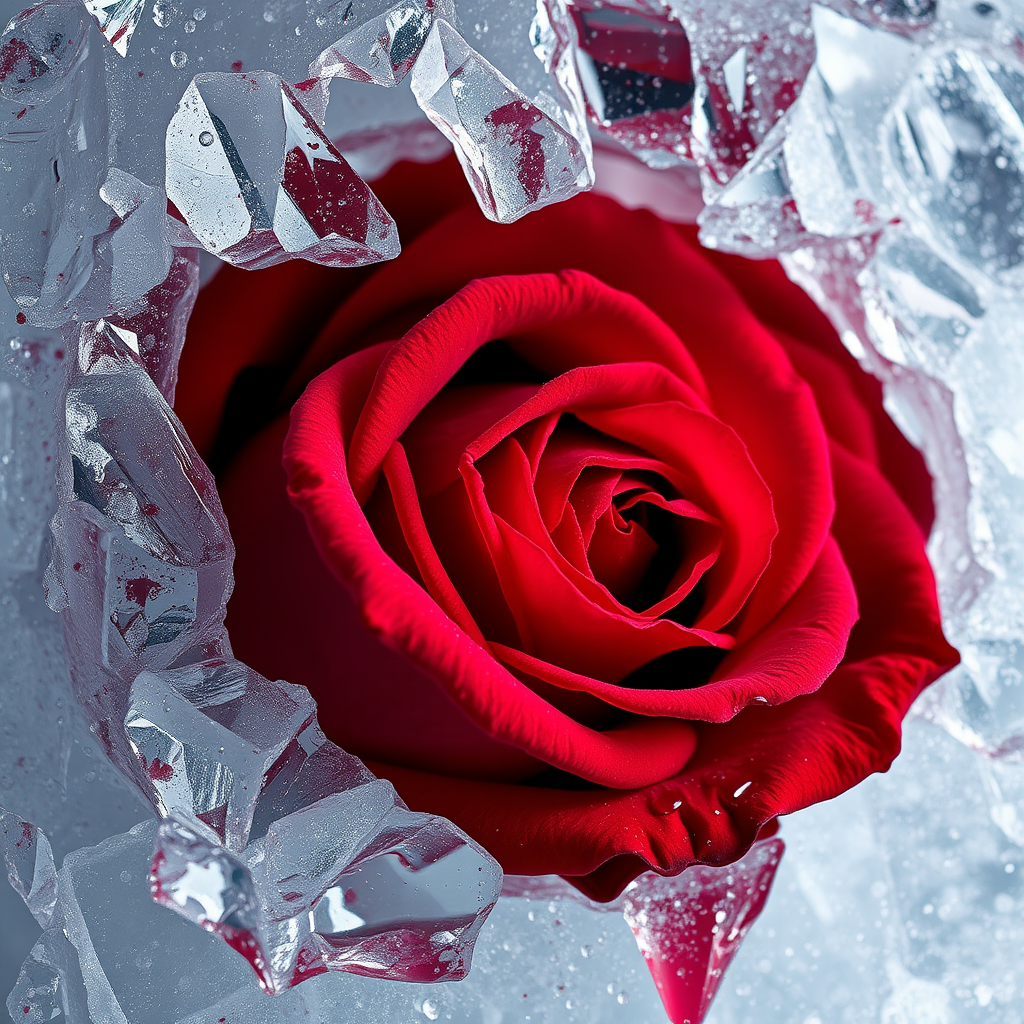 A close-up image of a stunning crimson rose emerging through a crystalline block of ice, the fractured and splintered surface glistening with frosted hues, delicate droplets of red seeping from the petals, as the ice gradually melts around it, evoking a sense of Valentine's Day romance, with a cinematic touch, sharp and intricate details, and a play of dramatic lighting highlighting the scene.
