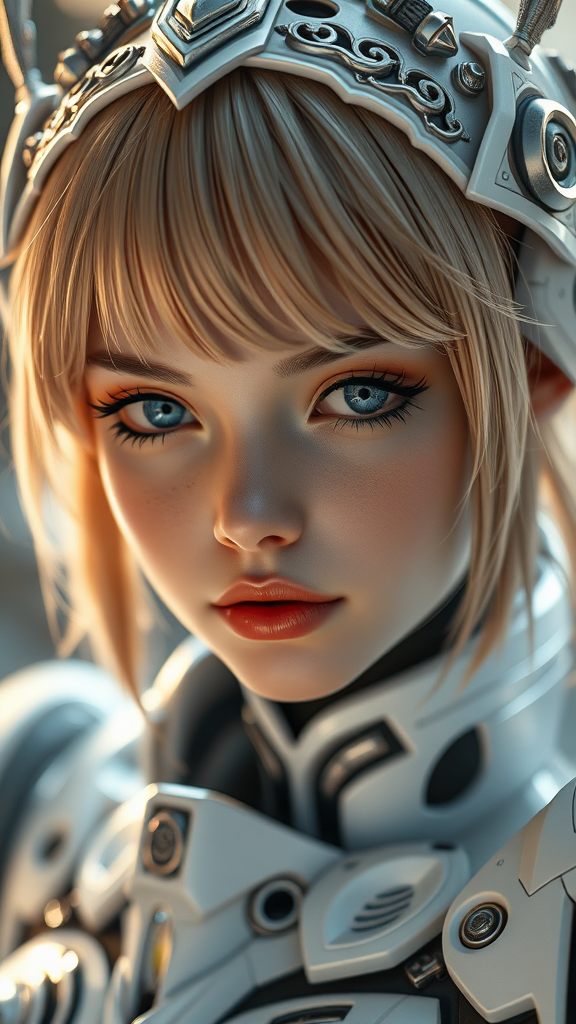A close-up image of a stunning mecha girl with dark-tipped beige blonde hair, an angelic face, and seductive eyes. She has pouty, thin lips and wears striking white-silver armor adorned with intricate head accessories. The scene is captured in HDR with ultra-high detail, featuring a soft bokeh effect and light bloom to enhance the cinematic lighting and illumination. The photorealistic quality reveals exceptional depth of field, blending concept art with Unreal Engine 5 and RTX technologies. Though ethereal and captivating, subtle imperfections are present, like the mysterious absence of certain parts, adding intrigue to her flawless appearance.