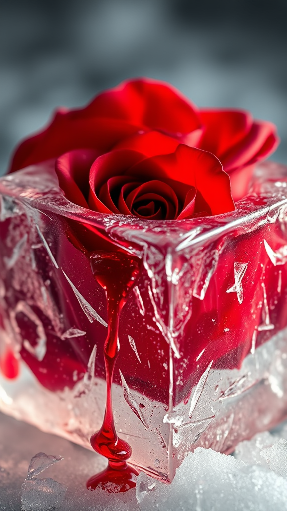 A close-up image of a stunning red rose emerging from a cube of ice, shards and fractures adorning the icy surface, hues softened by frosty tones, crimson drops trickling from the rose, ice slowly melting, evoking the essence of Valentine’s Day with a cinematic flair, sharp focus, with intricate details and dramatic lighting enhancing the scene.
