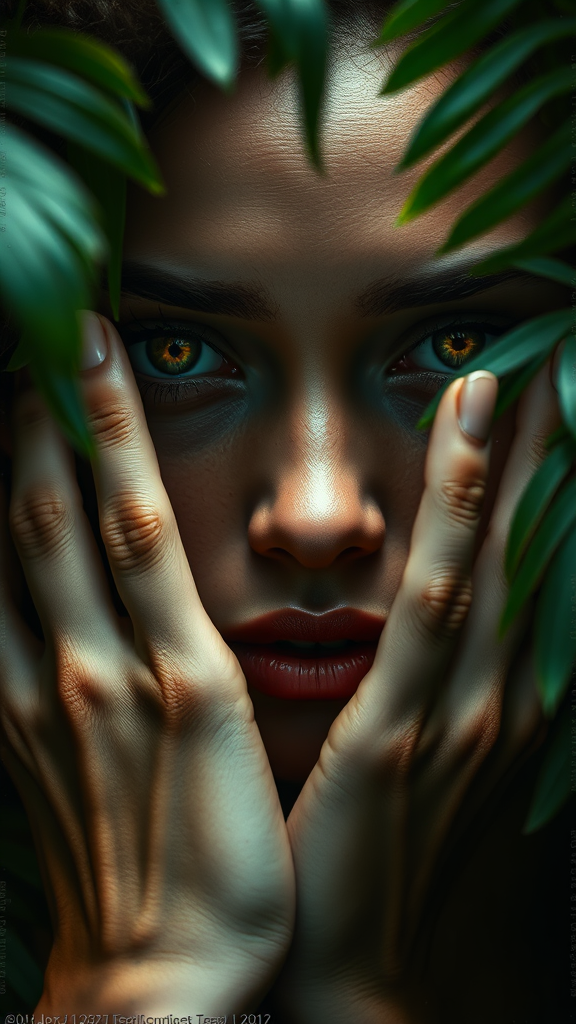 A close-up image of a woman emerging from the lush canopy of a rainforest, her eyes glowing with an ethereal allure. The texture of her skin is intricate and lifelike, capturing every fine detail, while her hands show an abstract imperfection that adds a surreal quality. There are subtle hints of text and artifacts around the edges, giving the image an enigmatic aura. Her form is slightly distorted, with oddly placed digits enhancing the dreamlike feel. The image retains a beauty that is both mesmerizing and slightly unsettling, as if captured in a mystical vision.