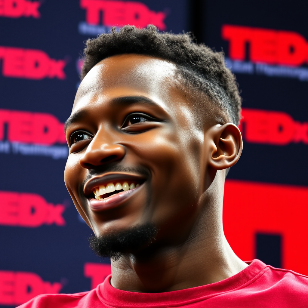 A close-up image of a young African man beaming with enthusiasm as he delivers a speech on a TEDx stage, set against a bright backdrop adorned with TEDx logos, exuding the energy of a motivational conference.