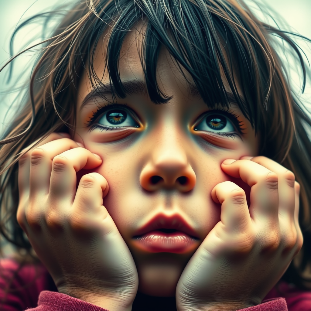 A close-up image of an anxious girl with tousled hair, her hands resting on her forehead as she gazes into the distance. The scene is infused with vivid and dynamic digital colors, enhancing the depth of her emotions and the intensity of her expression.