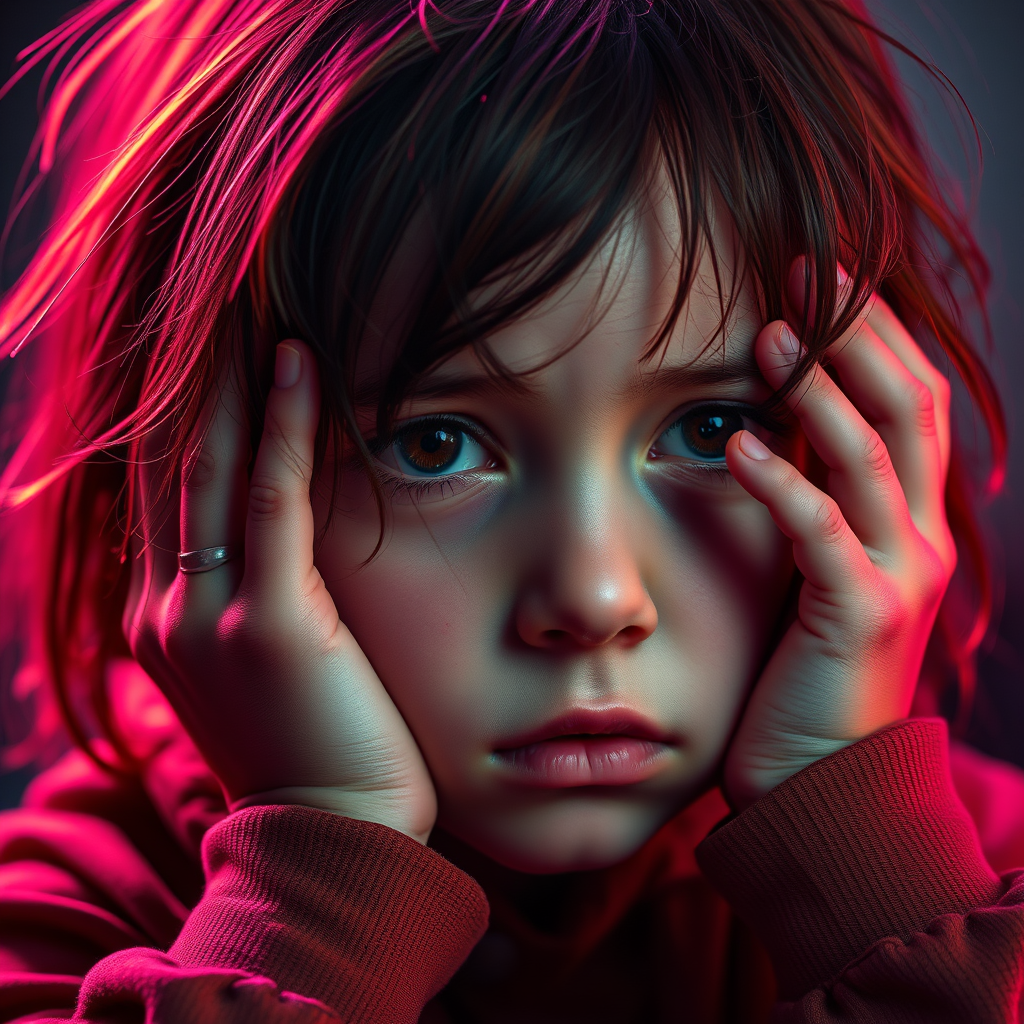 A close-up image of an anxious young girl with tousled hair, her hands gently cradling her forehead as she gazes intently into the distance, the scene awash in vivid, dynamic digital hues that add depth and emotion to her expression.