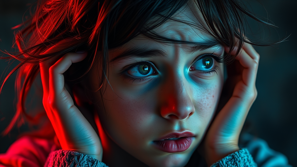 A close-up image of an anxious young woman with untamed hair, her hands pressed against her temples, gazing into the distance with a thoughtful expression, enhanced by vivid digital hues that add depth and emotion to the scene.