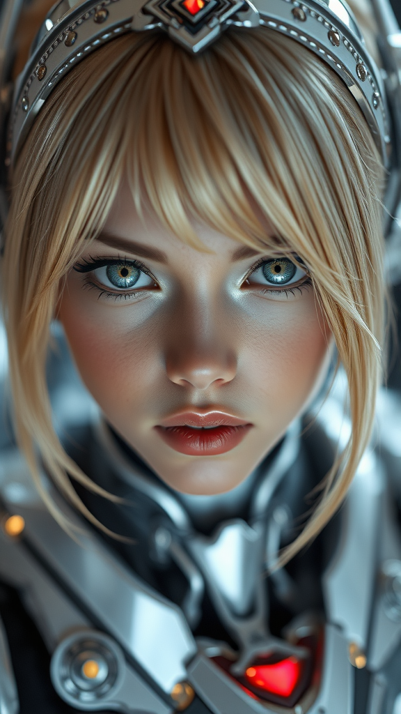 A close-up image of an enchanting mecha girl with ethereal, dark-tipped beige blonde hair framing her angelic face. Her seductive eyes are expressive, contrasting with pouty thin lips. She is adorned in gleaming white-silver armor, complemented by intricate head accessories. The scene is captured with HDR and ultra-high detail, featuring a soft bokeh effect and subtle light bloom. Cinematic lighting highlights her features, creating a stunning illumination that enhances the depth of field. The concept art is rendered using the latest unreal engine 5 and RTX technology for a photorealistic finish. She is portrayed with an air of mystery, with missing arms and hands, adding an intriguing asymmetry to her form.