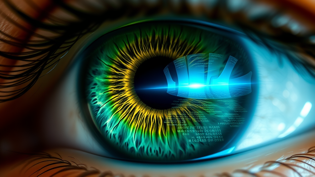 A close-up macro photograph captures an intricately detailed green eye, evoking the feel of a cinematic film still. The iris displays a mesmerizing pattern of rich greens and golds, while the pupil reflects a serene digital landscape, where lines of code gently scroll over a soft blue glow, suggesting a world of technology beyond the gaze.