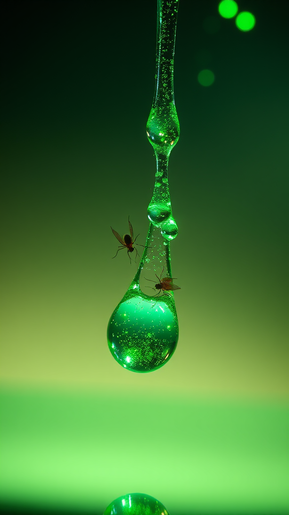 A close-up microscopic image capturing mites suspended in a shimmering drop of water, with cascading emerald sparks illuminating the scene against a smooth gradient backdrop. The vibrant sparks emit a vivid green glow, casting dynamic reflections and intricate patterns of light. The use of shallow depth of field and volumetric lighting enhances the cinematic quality, showcasing ultra-realistic, finely detailed textures. Set against a calm yet enthralling background, the image radiates controlled chaos, with an aspect ratio of 12:24, blending microscopic intricacy with cosmic beauty.