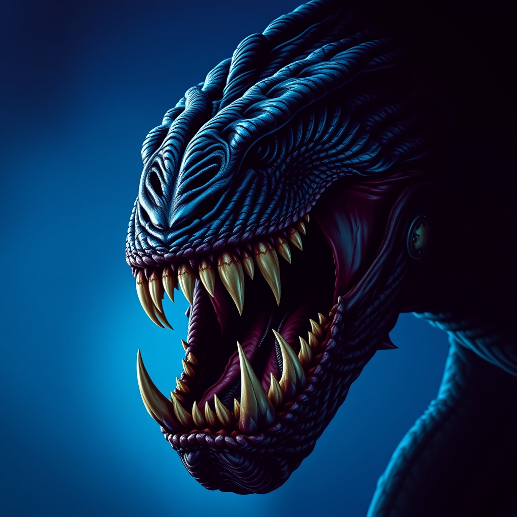 A close up of a creature with its mouth open, inspired by Charles Fremont Conner, featuring film key art with a clear dark background. The image is a detailed full-body portrait, designed for a profile picture at 1024px, incorporating the style of artgeem. The creature is depicted against a vibrant blue backdrop, showing intricate textures, poised to bite, set in a sewer environment. The artwork captures a dynamic and intense expression, with a tall 9:16 aspect ratio.