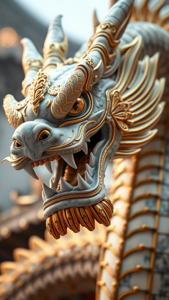 A close-up of a dragon statue, crafted from marble with intricate gold and white detailing, featuring complex patterns and an elaborate design. The dragon exudes an intense, angry expression. It is a 3D render with cinematic lighting, capturing light reflections and using octane render technology. The image is hyper-detailed, with a sharp focus, real shadows, and a depth of field effect, all in 8K resolution. The scene delivers a cinematic, movie-quality feel with photography-style lighting and an overcast reflection map. Every element is ultra-realistic with the highest detail quality. The composition retains dramatic flair with unique artistic adjustments, avoiding anatomical anomalies and ensuring the dragon's design remains majestic and cohesive.