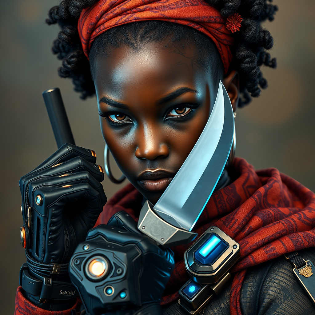 A close-up of a fierce African woman with determined eyes, holding a sleek, futuristic knife in one gloved hand, embodying the essence of an African cyberpunk wizard. Her attire is an exquisite blend of cyberpunk and steampunk aesthetics, showcasing a harmonious fusion of traditional African patterns with advanced, metallic textures. This teenage black cyborg's skin is interwoven with glowing biotech enhancements, and she wears a mechanized, fashionable exoskeleton, reflecting her duality as a cyberpunk and steampunk alchemist. Her afro, adorned with subtle, luminescent cybernetic embellishments, pays homage to the afrofuturism movement. The scene captures her as a skilled cyborg merchant woman, akin to the skillful designs of characters like Loba Andrade from Apex Legends and Ororo Munroe. Her look is both regal and edgy, reflecting a world where culture and technology coexist in a symphony of innovation and tradition.