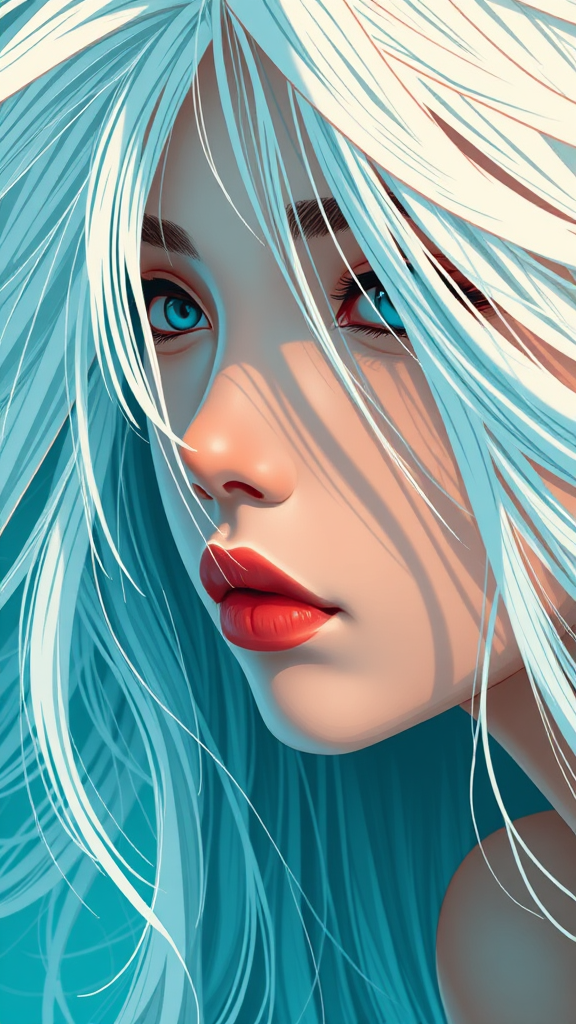 A close-up of a girl with flowing white hair, capturing the dynamic essence of Ross Tran's style. The color palette balances light teal and dark orange hues, reminiscent of Guido van Helten's striking compositions. The image draws inspiration from comic art's bold lines and detail, blended with the softness and depth of realistic marine paintings. This artwork has an animated quality, as if part of a vivid gif, and retains a high degree of stylization, inviting viewers into an immersive and expressive world.