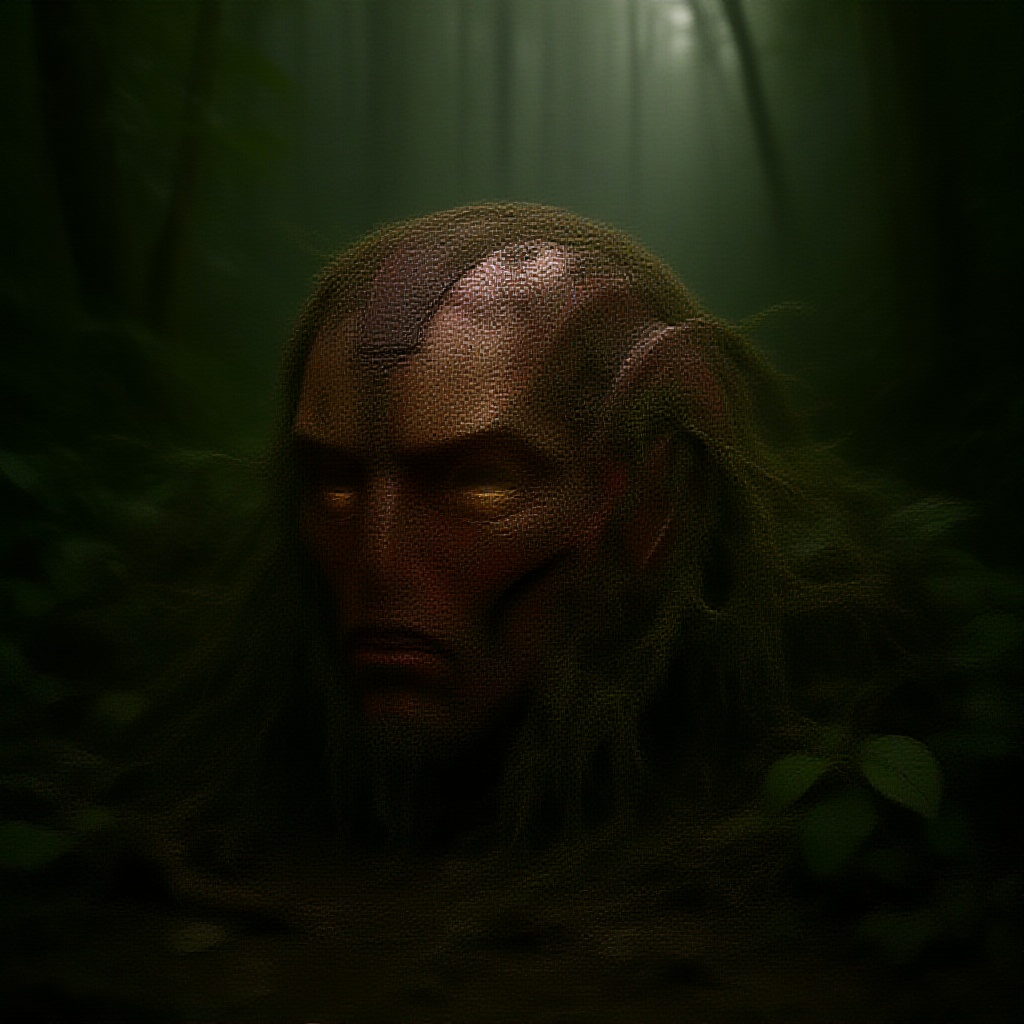 A close-up of a heavily corroded Iron Man helmet lies abandoned amidst a dense jungle, overtaken by nature. Thick vines entwine the suit, their grasp partially concealing it with layers of moss and vibrant jungle foliage. The iconic red and gold armor has succumbed to the elements, with chipped paint and deep rust scars marring its surface. The once-bright arc reactor on the chest emits a weak, flickering light, nearing extinction. The jungle floor, damp and strewn with fallen leaves, is shrouded in a gentle mist rising in the background. Soft, diffused beams of sunlight pierce through the thick canopy above, casting haunting shadows across the forgotten relic. The scene unfolds with cinematic intensity, rendered in hyper-realistic detail, capturing the essence of decay and abandonment in high-definition 8k resolution.