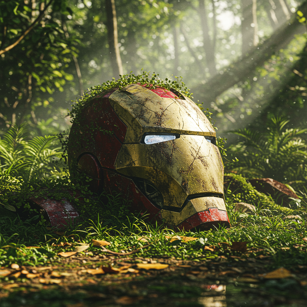 A close-up of a heavily corroded Iron Man helmet lying abandoned on the ground in a dense, overgrown jungle, where nature has begun reclaiming the relic of technology. Vines tightly wrap around the helmet and the torso of the suit, blending it into the vibrant greenery with blankets of moss and lush foliage. The once-vibrant red and gold of the armor are dulled and marred with chipped paint and deep rust marks, testament to years of exposure to the elements. The arc reactor, faintly illuminating, struggles to maintain a steady glow, flickering intermittently like a dying ember. The jungle floor, damp from recent rains, is strewn with a rich tapestry of fallen leaves, while a gentle mist rises, casting a mystical shroud over the scene. Sunlight filters through the thick canopy above, its diffuse rays casting intricate, shifting shadows on the forgotten relic. The setting feels both tranquil and hauntingly beautiful, evoking a sense of lost glory and the inevitable passage of time. Cinematic hyper-realism with high detail, captured in an octane render at 8k, ensures every element is vividly realized, imbuing the scene with an evocative, almost otherworldly presence.