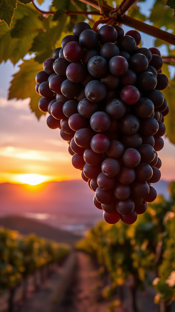 A close-up of a large bunch of grapes glistening under the warm glow of the setting sun, hanging gracefully from a lush vine. The vineyard stretches out beneath the twilight sky, bathed in golden and purple hues. The skyline elegantly outlines distant hills, capturing the serene yet vibrant beauty of the landscape. The intricate details of the grape skin and delicate tendrils are reminiscent of an award-winning photograph by Phil Koch, encapsulating the essence of nature's bounty with a touch of creative wonder.