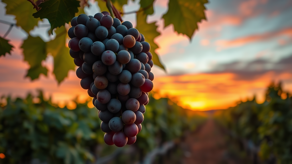 A close-up of a large cluster of grapes dangles from a vine in a vineyard at twilight, the rich colors of the sunset painting the sky in the background, as seen through the lens of an acclaimed photographer known for capturing intricate details and breathtaking landscapes.