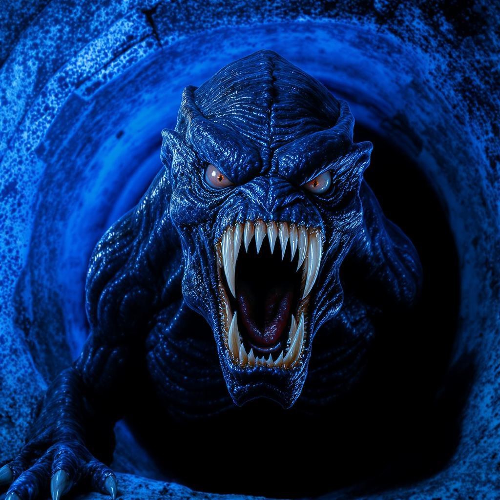 A close-up of a menacing creature with its mouth open, inspired by film key art, in the style of Charles Fremont Conner. The image features a detailed full body portrait with a vivid, bright blue background. The creature is poised as if ready to strike, with sharp teeth glistening and intense eyes. The darkened setting suggests the entrance to a mysterious sewer, adding an element of suspense. The composition is designed as a visually captivating profile picture at 1024px, maintaining a balance between realism and artistic flair, capturing the essence of the creature's threatening presence.