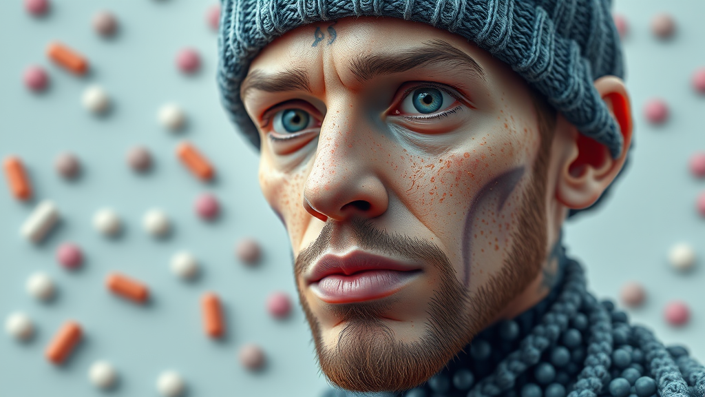 A close-up of a person with a beanie in digital art style, influenced by Kubisi art, resembling a Behance contest winner, with neo-dada elements. The character is designed as a 3D concept, covered in barnacles with a bubblegum-textured body. It carries features reminiscent of a Walter White Fortnite skin, with an elated gaunt onion-shaped head. The portrait captures the essence of a machine man, delivering a high-quality and cute artistic feel. The full-body image is hyper-detailed, featuring scattered pills against a backdrop, blending whimsy with surrealism.