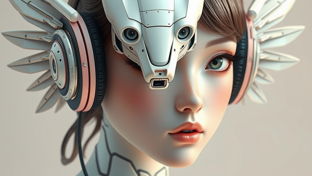 A close-up of a person with intricately designed winged headphones, merging surreal sculpture and photorealism with a touch of pastel colors. Inspired by Jeonseok Lee, this piece exudes a modern twist reflecting 2020 fashion and Korean aesthetics reminiscent of an Audrey Hepburn automaton. The character displays elements from game headphone designs, showcasing a full body and head view, influenced by Sascha Schneider's style. The head takes on an animalistic undertone, blending realistic cartoon elements with an airbrushed finish. This mind-bending image portrays a hybrid fusion of human and mechanical tank, complete with a distinctive hairband that adds a unique twist.