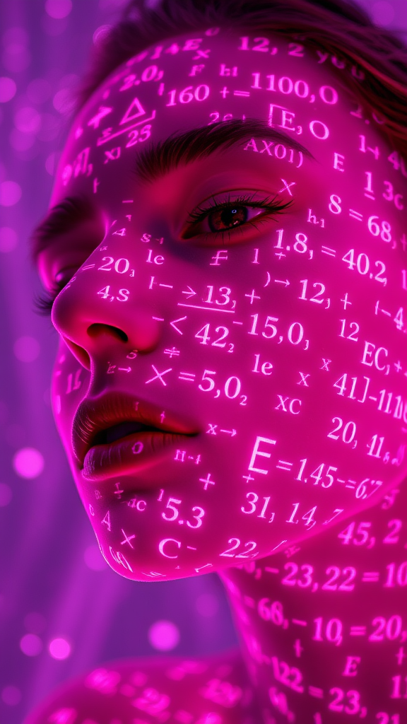 A close-up of a person's face illuminated by a cascade of iridescent equations, projected in DayGlo pink across their skin against a surreal, ghostly backdrop. The constantly shifting mathematical symbols create a mesmerizing interplay of light and shadow, blending seamlessly with an ambient scene that feels both futuristic and mystical. The background is an ethereal tapestry reminiscent of a digital fantasy realm, evoking the immersive depth of a video game world, where every equation pulses with rhythmic, cinematic fluidity beneath a veneer of perfect symmetry.