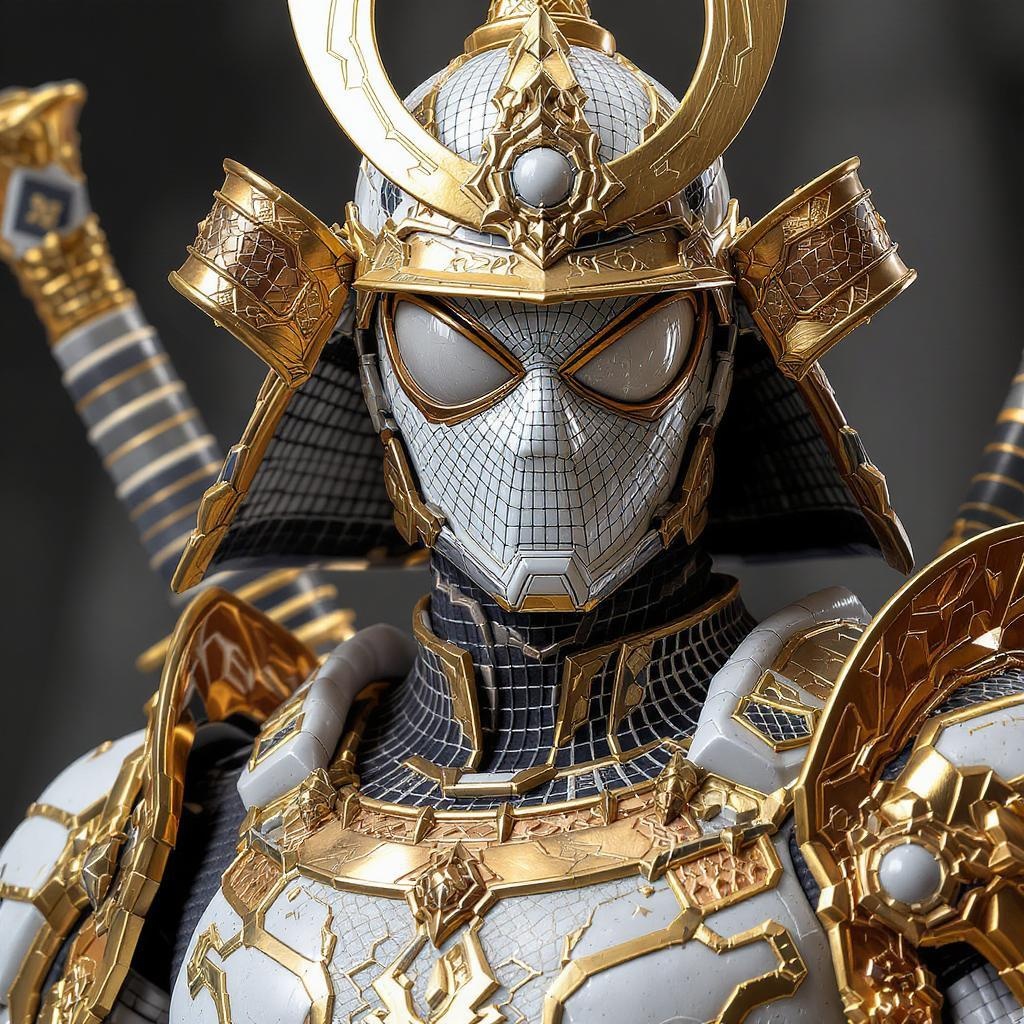 A close-up of a statue depicting a man in a luxurious gold and white outfit, showcasing intricate details characteristic of a high-definition 3D render. The figure is clad in ornate, futuristic samurai armor reminiscent of a Spider-Man theme, highlighted by the elegance of white and gold accents. Every facet of the armor, from the finely carved helmet to the elaborate gauntlets, is rendered with hyper-realistic precision, capturing the heroic essence of an iconic character. This super detailed render utilizes the capabilities of octane rendering to provide an unparalleled sense of depth and texture, merging traditional samurai aesthetics with a modern, technological twist. The entire composition is presented in an 8k resolution, revealing each element of its futuristic style with meticulous clarity.