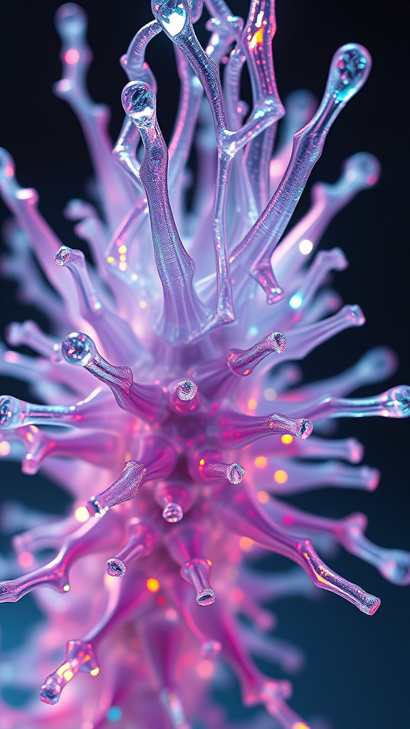 A close-up of a translucent spike with layered spikes, rendered in V-Ray tracing, featuring a molecular structure intertwined with twisted branches, infused with holographic hues. The design is inspired by ZBrush techniques, with a touch of foampunk, creating a luminous sfumato effect. The composition highlights the intricate interplay of light and shadow, with vibrant colors seamlessly blending in a raw, organic texture, set in an abstract vertical orientation of 9:16.