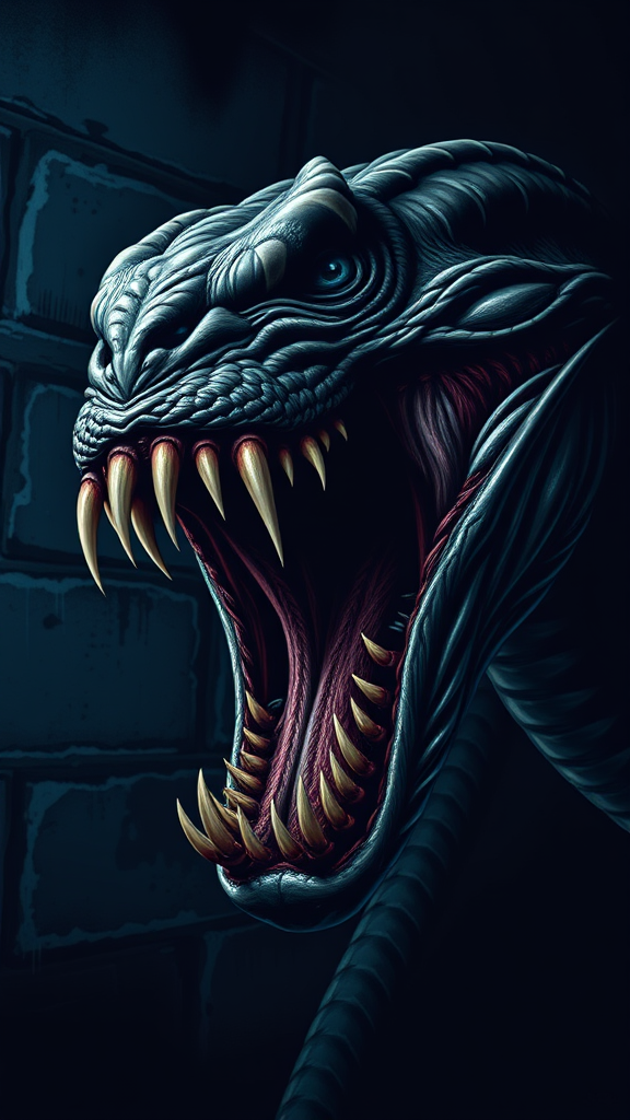 A close-up of a venomous creature with its mouth wide open, inspired by the style of Charles Fremont Conner, set against a stark, dark background. The image is 1024px, ideal for a profile picture, featuring a vivid blue wall adding contrast. The creature is portrayed in a detailed full-body portrait, captured in the act of biting within the atmosphere of a dimly lit sewer. The artwork evokes a sense of imminent danger with a focus on texture and intricate details, presented in a vertical format.