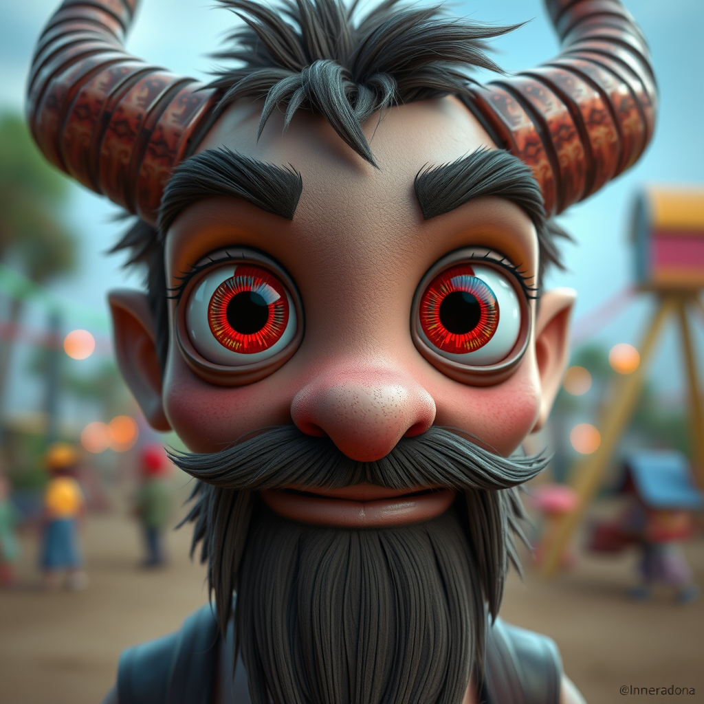 A close-up of a whimsical character with horns and a beard, evoking a playful blend of fantasy and cartoonish charm. The portrait is imagined by a senior character artist who has won accolades in competitions, rendered with Unreal Engine 5 for stunning realism and artistry. Captivating, bright neon eyes reminiscent of Pixar, filled with curiosity, and reflecting a vivid playground scene inspired by Nomeradona. The character boasts cute, oversized circular eyes, adding a toy-like quality to the overall design, with a touch of surrealism. The visual is imbued with intricate, abstract details, resulting in a slightly disfigured yet endearing cartoon aesthetic. Despite an intentionally rough, low-res appearance with exaggerated features, such as extra limbs or blurred outlines, it exudes charm through its toy-like, animated essence. This experimental composition may seem awkwardly composed, with surreal anatomy and blurred textures, yet it celebrates the imaginative spectrum of cartoon artistry, offering a framed 3D visual narrative with bold, unconventional colors akin to a creative freehand doodle on paper, sprinkled with whimsical imperfections.