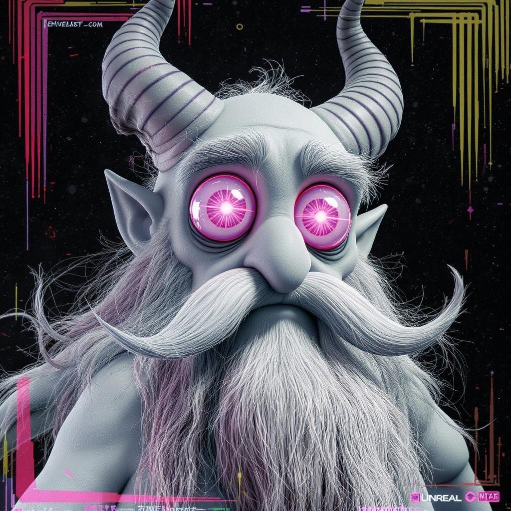 A close up of a whimsical man with horns and a flowing beard, designed as a character portrait by a renowned senior character artist and a winner of the polycount contest. Rendered in Unreal Engine 5, this creation captures computer art at its finest. The vivid neon eyes, reminiscent of Pixar's aesthetic, play within a scene inspired by Nomeradona’s playground. Featuring oversized and reflective circular eyes, the figure embodies a blend of cartoonish charm and surreal abstraction, with intricate, blurred details that suggest a dreamlike quality. The character, a mix of toy-inspired design and animated whimsy, boasts soft contours and unusual features that defy conventional anatomy. In black and white, with bursts of strange, vibrant colors, the image is intentionally low-res and blurred, adding to its surreal, disfigured appearance. Its intentional imperfections and abstract style, along with digital artifacts like watermarks and text, lend a playful yet eerie twist to the convention of 3D character art.