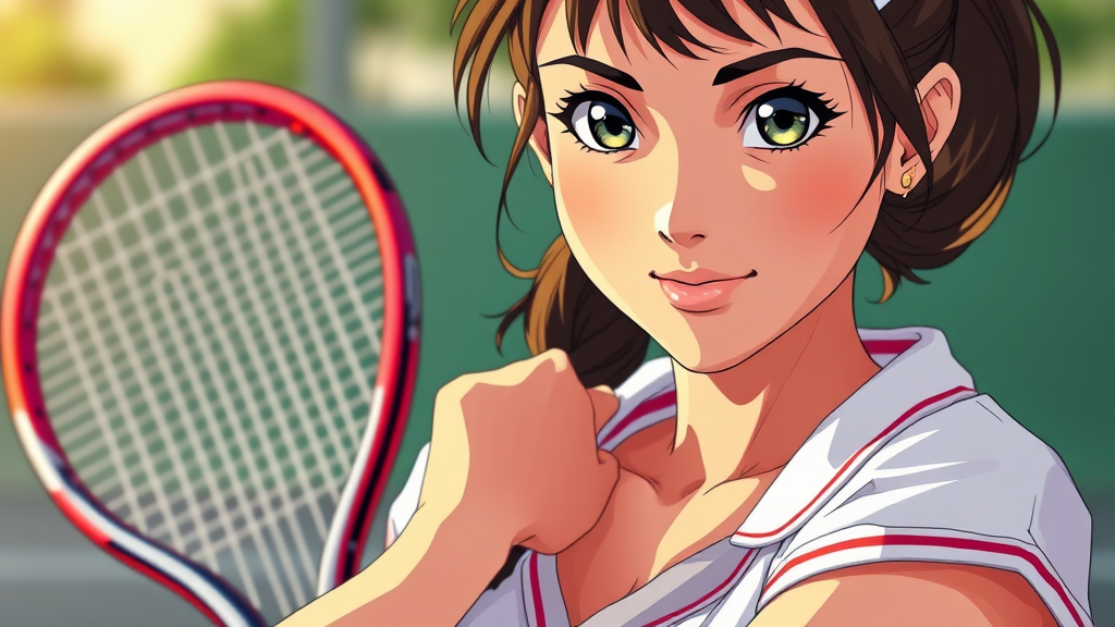 A close-up of a woman in a classic tennis uniform holding a tennis racket, featuring a retro anime art style reminiscent of the 1980s and 1990s. She has a youthful, energetic appearance similar to Misty from Pokémon, with vibrant expressions and dynamic poses. The art captures the vibrant colors and detailed linework typical of 80s anime, blended with realistic 3D elements that give depth and texture to her form, set against a softly blurred, nostalgic background conveying a sense of timelessness and action.