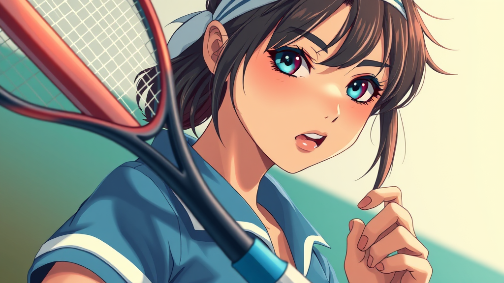 A close-up of a woman in a vintage uniform holding a tennis racket, inspired by retro anime style, featuring a character with features reminiscent of Misty from Pokémon. Her expression is determined, channeling the vibrant and nostalgic essence of 1980s and 1990s anime art. The artwork captures the realistic 3D style anime vibe, blending the classic aesthetics of 1980s anime with a modern twist. The character is adorned with a headband, tousled hair, and fashionable tennis sneakers, set against a softly lit background that enhances the retro anime flair.