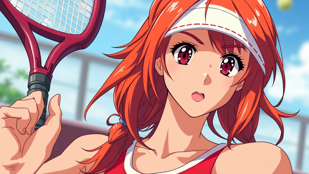 A close-up of a woman with fiery red hair in a vintage tennis outfit, holding a racket confidently, evoking the spirit of Misty from Pokemon. Set in a nostalgic 1980s anime art style, her wide, expressive eyes and dynamic pose capture the essence of retro anime. The vibrant colors and detailed shading reflect the realistic 3D aesthetic of the era, blending seamlessly with the classic hand-drawn techniques of 1990s anime art. The scene exudes a timeless charm, showcasing the fusion of past and present anime styles, reminiscent of iconic characters from beloved classic series.