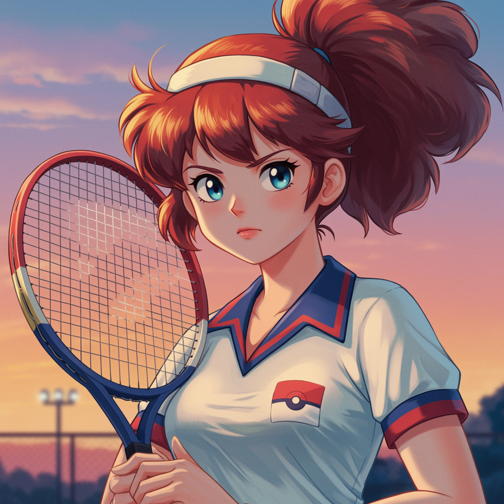 A close-up of a young woman in a vintage sports uniform holding a tennis racket, her expression focused and determined. Her style is reminiscent of 1980s anime, with large expressive eyes and distinct facial features. Her hair is styled in the exuberant fashion typical of retro anime, resembling Misty from Pokemon with its captivating flair. The art style merges the nostalgic charm of 80s and 90s anime with a modern, realistic 3D touch, highlighting the vivid colors and intricate details of her attire. The background features a soft, pastel-colored sunset, accentuating the anime’s classic theme yet updated with contemporary elements.