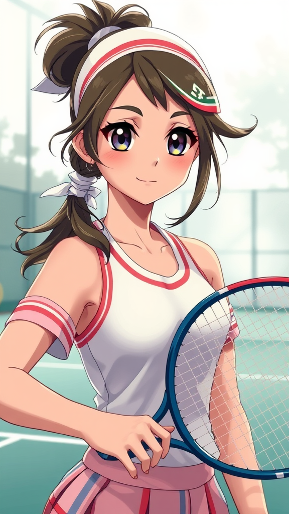 A close-up of a young woman in a vintage tennis uniform, holding a tennis racket with a confident stance, capturing the essence of Misty from Pokémon. She features large, expressive eyes and vibrant hair reminiscent of 80s and 90s anime art styles. Her attire is distinctly retro, with bright colors and classic patterns that evoke the nostalgia of 1980s anime. The scene is rendered in a realistic yet stylized 3D manner, blending the charm of traditional hand-drawn anime with modern detailed textures. The background is abstract and nostalgic, echoing the misty mornings of an old tennis court, enhancing the vintage anime atmosphere.