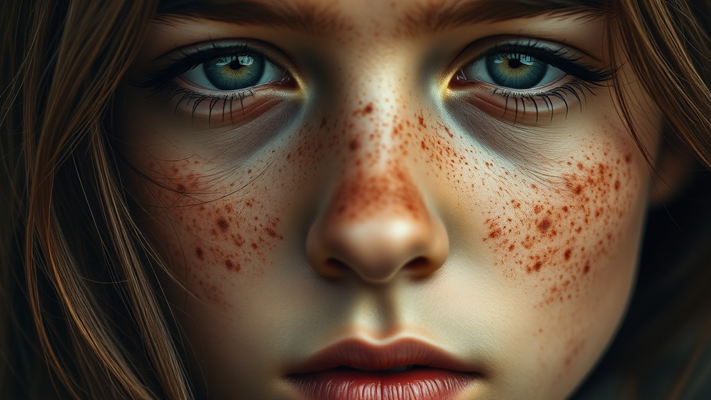 A close-up of a young woman with freckles scattered across her face, her skin a rich, earthy brown reminiscent of fertile soil. Her features are captured in hyperrealistic detail, evoking the signature style of Albert Watson, with a touch of Antoni Pitxot's surreal artistry. She possesses a timid and vulnerable expression, blending innocence with depth. Imagined as an epic music album cover, the composition is infused with the dramatic shading of charcoal and the illustrative flair of Graham Humphreys. The girl's beauty is tender and timeless, her gaze slightly averted, inviting both curiosity and admiration.