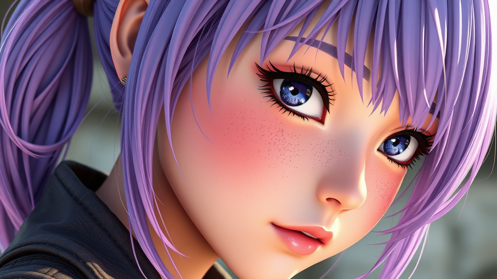 a close-up of a young woman with lavender-hued hair tied in a ponytail and a worn leather jacket, 3D rendered character art with 8K resolution, portraying a realistic, anime-inspired female lead with intricate details, such as visible eyelashes, delicate freckles, and sun-kissed skin, in a photorealistic yet stylized rendition, highly detailed and textured to convey a sense of depth and dimension, showcasing a strong, confident persona, while maintaining an air of mystery and subtle, nuanced emotion, blending the lines between reality and fantasy, blending realistic and unreal elements, resulting in a captivating and engaging, 3D anime-styled character concept.