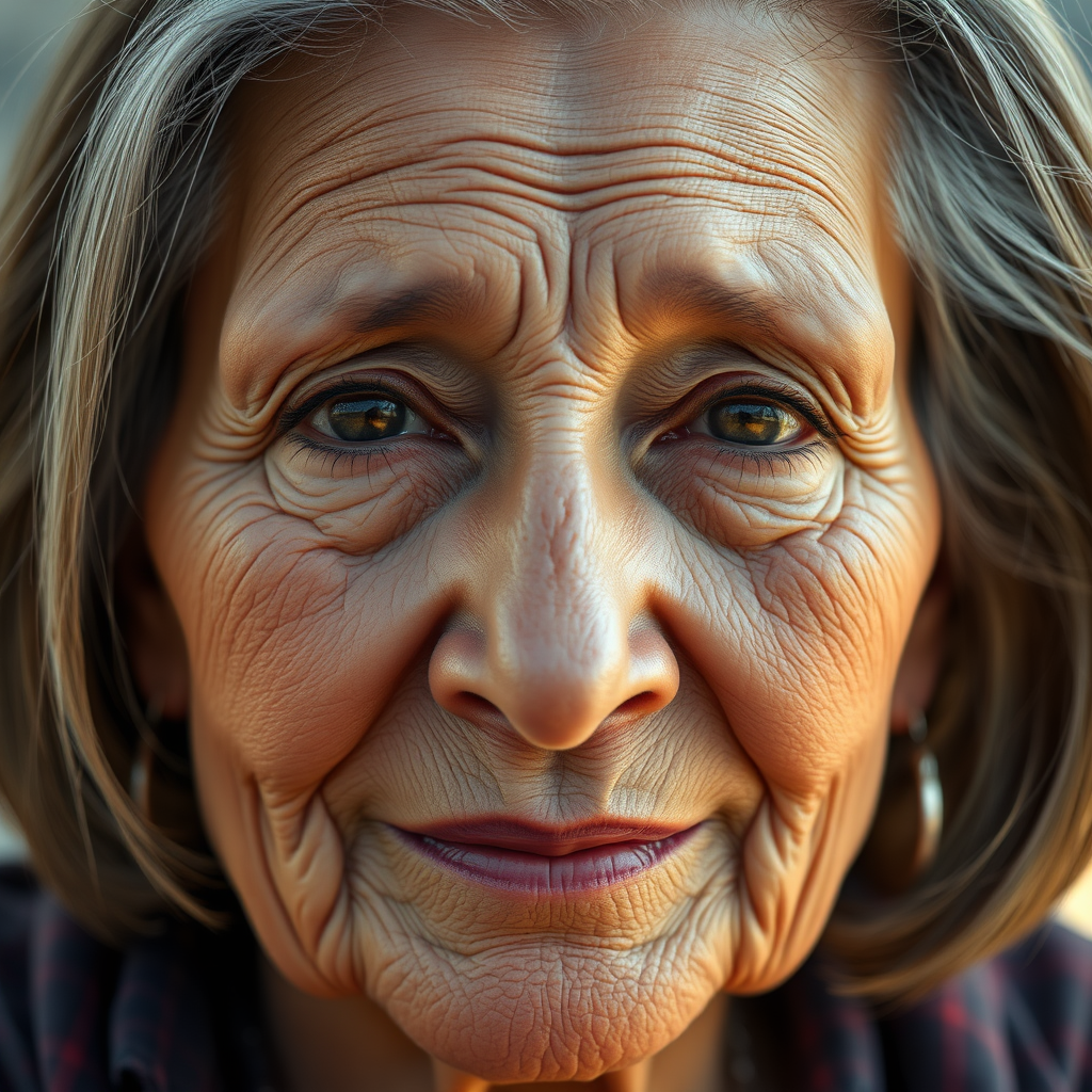 A close up of an elderly Latina woman with a medium-length hairstyle, slightly sun-kissed skin, captured in gentle daylight, exhibiting intricate facial features and textures, her eyes conveying depth and emotion, a serene expression with a hint of a smile, captured in ultra-high definition, 8K resolution, with emphasis on authenticity and detail in her natural ambiance.