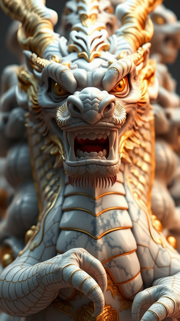 A close-up of an intricately crafted dragon statue made from marble, featuring gold and white accents, with elaborate patterns and a complex design. The statue exhibits an angry expression, brought to life with cinematic lighting that highlights light reflections. Created in octane render, the piece is a hyper-detailed 3D masterpiece, focused and meticulously crafted, captured in 8K resolution with depth of field that adds real shadows and sharp focus. This ultra-realistic render displays extreme detail quality, reminiscent of movie-level photography with overcast reflection mapping. The visual captures an array of stacked torsos in a totem pole style, yet deliberately incorporates elements of surrealism with abstract anatomy, adding a layer of intrigue with extra and missing limbs, creating a fantastical yet eerie aesthetic. The artistry blurs the line between reality and imagination, delivering a uniquely captivating and visually striking creation.