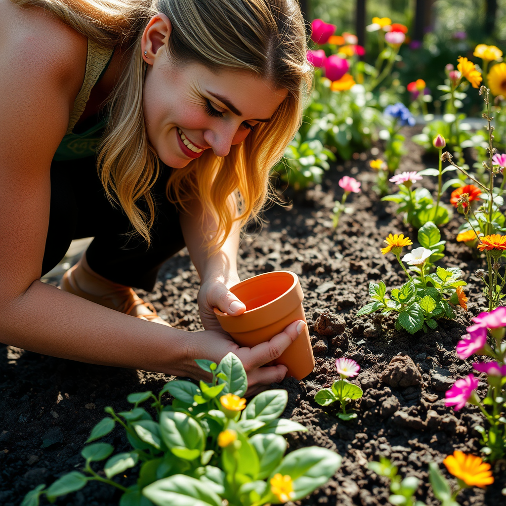 A close-up of Emily gently placing a small terracotta pot into the rich, dark soil of her vibrant garden. She steps back, the sunlight catching the flecks of determination and contentment in her eyes. With a deep, satisfied sigh, she surveys the colorful tapestry of blossoming flowers and greenery around her, feeling a deep connection to the earth and her growing creations.