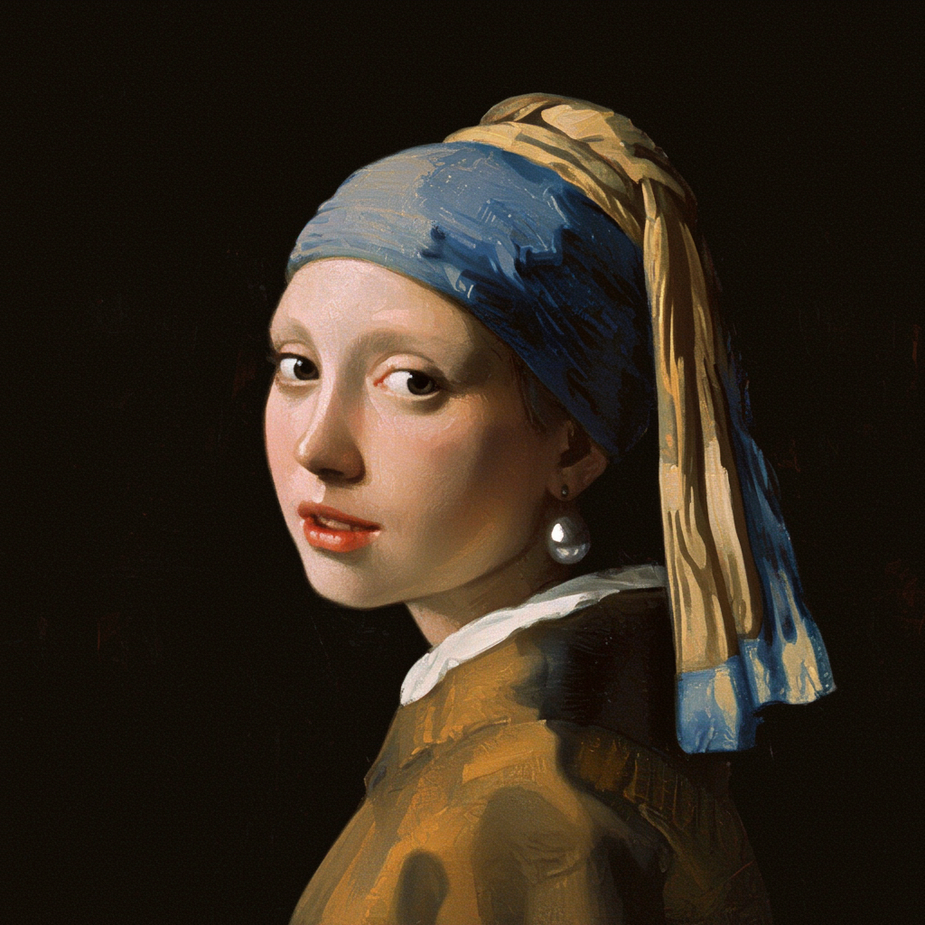 A close-up painting of a young woman adorned with a luminous pearl earring, rendered in the rich, detailed style of the Dutch Golden Age. The artwork captures the serene expression and delicate features of the girl, accentuated by the warm, muted tones and soft light typical of late 19th-century Venetian school paintings. Inspired by Francesco Solimena, the composition showcases masterful chiaroscuro and intricate brushstrokes to bring the subject to life, with subtle creative touches that add a unique twist to the classic portrayal. The aspect ratio is 101:128, emphasizing the depth and intimacy of the portrait, while a stylized approach at level 750 imbues the piece with a sense of timeless elegance.