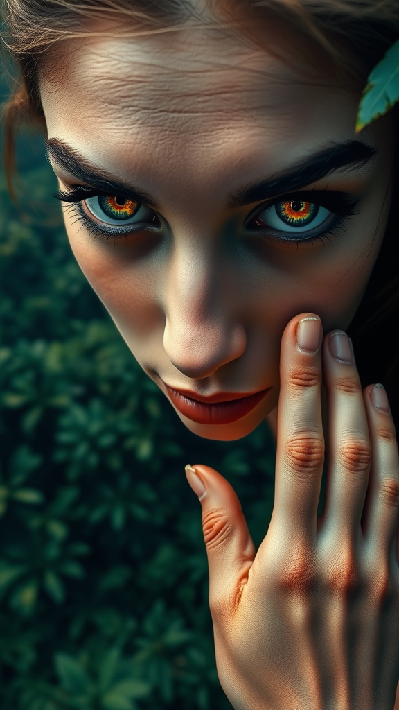 A close-up photo captures a woman above a lush rainforest, her eyes shining with an ethereal allure and a vibrant, otherworldly beauty. The image is ultra-high-definition and intricately detailed, revealing captivating textures and colors. Her hands, though featured in low resolution, show abstract and distorted anatomy, with missing fingers and extra digits adding a surreal quality. The image is marked by intentional flaws like cropping, JPEG artifacts, low and normal quality areas, and a blurry signature, creating a uniquely imperfect yet compelling aesthetic. The photo has an enigmatic allure with deformed and missing elements adding to the mystery.