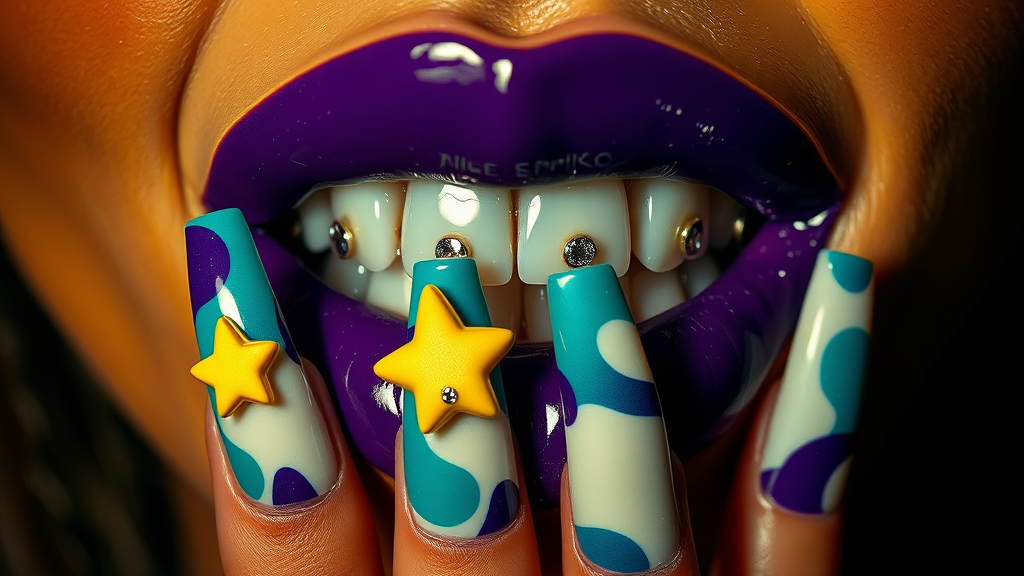 A close-up photograph captures glossy, deep purple lips slightly parted and twisted, revealing teeth adorned with sleek, platinum grillz. The lips shine with a high-gloss, wet-look finish, dramatically reflecting light. Long, vibrant acrylic nails featuring a bold abstract pattern of teal, cobalt, and ivory press gently against the lips. One nail boasts a cheerful yellow star charm encircled by tiny rhinestones. The lighting is moody and cinematic with warm amber hues and soft shadows. The image exudes a grainy, film-like texture, reminiscent of high-fashion editorial photography. Shot with a macro lens, it features a shallow depth of field, high contrast, and a vintage 35mm film aesthetic.