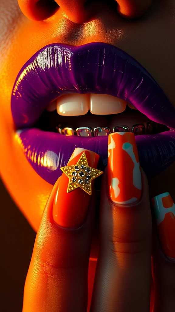 A close-up photograph captures glossy, deep purple lips slightly parted and playfully twisted to reveal teeth adorned with sleek silver grillz. The lips glisten with a high-shine, wet-look gloss, dramatically reflecting the light. Exquisite, long acrylic nails showcase a bold abstract pattern of orange, turquoise, and white pressed gently against the lips. A single nail is accented with an eye-catching yellow star charm encircled by tiny sparkling rhinestones. The lighting is moody and cinematic, with warm amber hues and soft shadows casting an inviting glow. The image embraces a grainy, film-like texture, exuding a high-fashion editorial vibe reminiscent of classic cinematic photography. Shot with a macro lens, the scene features a shallow depth of field, high contrast, and a vintage 35mm film appeal.