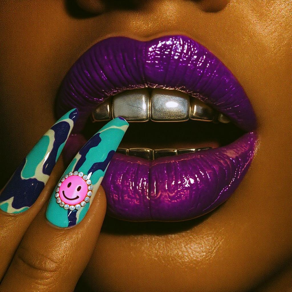 A close-up photograph captures glossy deep purple full lips, slightly parted and playfully twisted to reveal teeth adorned with a sleek silver grillz. The lips shimmer with an intense high-shine, wet-look gloss, reflecting the light in a mesmerizing way. Long, vibrant acrylic nails showcase a bold abstract pattern of teal, blue, and white pressing gently against the lips. One nail is decorated with a playful pink smiley face charm encircled by tiny opalescent rhinestones. The lighting casts a moody, cinematic atmosphere with warm golden hues and soft shadows. The image has a textured, grainy finish reminiscent of high-fashion editorial photography, shot with a macro lens, a shallow depth of field, high contrast, and a vintage 35mm film aesthetic.