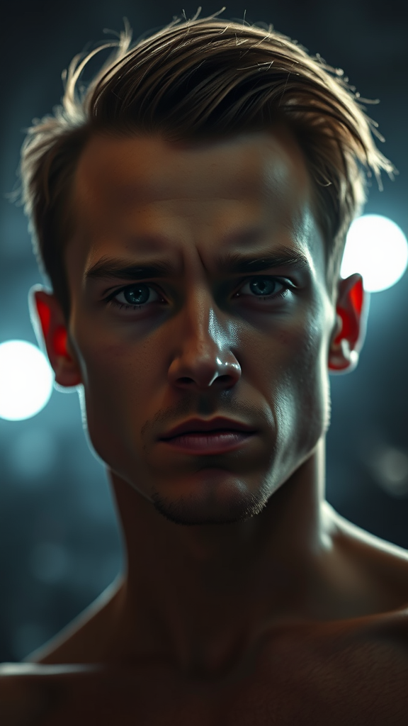 A close-up portrait of a 30-year-old man with a slender, athletic build and a stunning face, displaying a frowning yet innocent expression. His hair, adding to his striking features, is captured against an oppressive and contrasting background, creating a dramatic and expressive atmosphere. The setting has a gloomy, almost crushing horror feel, enhanced by backlighting from within. The scene is shot cinematically from below using a DSLR with an aperture of f/7, shutter speed of 1/100 sec, and ISO 150. The image is hyper-photorealistic with incredible detail, showcasing natural reflections and cinematic lighting. Despite the eerie background, the subject remains the central focus, ensuring no elements like multiple heads, limbs, or distorted anatomy interfere with the composition. The man's symmetrical features stand out, framed by the intense and atmospheric lighting that adds depth and drama to the portrait.