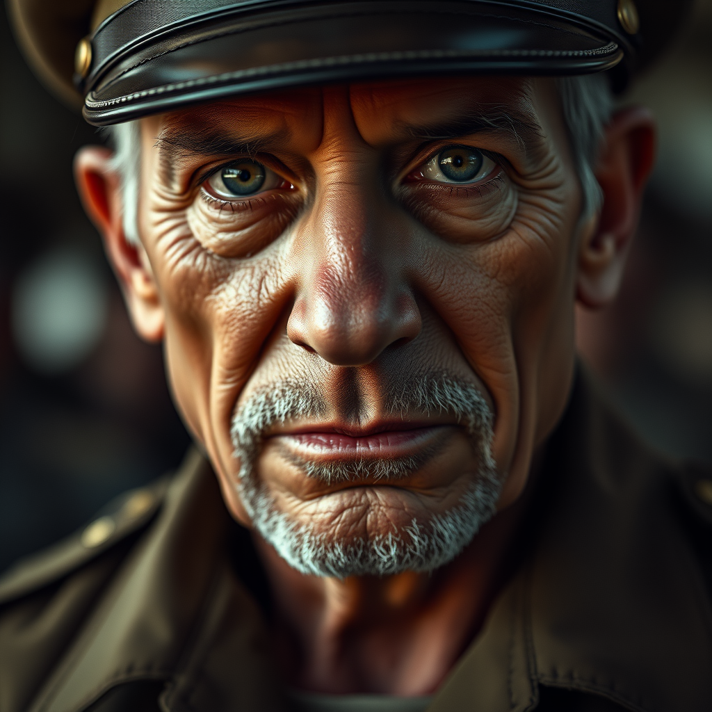 A close-up portrait of a 62-year-old resilient, battle-hardened general, clean-shaven with a serious and stoic expression, captured in a cinematic 4k epic detailed style. The image is shot on Kodak with intricate details and a dramatic bokeh effect, evoking the moody and dark ambiance of an HBO series, showcasing the wisdom and strength etched into his features. The general's eyes reflect a lifetime of service and leadership, underscored by subtle shadows that add depth and character to the composition.
