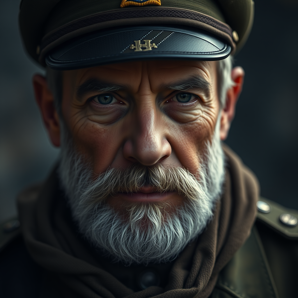A close-up portrait of a 62-year-old seasoned general, rugged and adorned with distinguished accolades, clean-shaven with a focused and steadfast expression. The image is captured in 4k, revealing cinematic and epic details, using Kodak film to achieve a rich, dark, and atmospheric mood. The background exhibits a subtle bokeh effect, enhancing the dramatic feel reminiscent of a high-end HBO production.