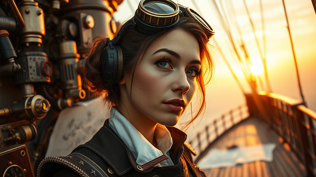 A close-up portrait of a beautiful female steampunk inventor set aboard an airship during sunset. She gazes thoughtfully into the distance, surrounded by intricate mechanical tools and gadgets, her attire adorned with brass and leather details. The warm hues of the setting sun cast a golden glow on her face, highlighting her intelligent eyes and delicate features. Her inventive spirit is evident in the array of tools and blueprints scattered around. The airship’s wooden deck and metal railings are visible in the background, adding a sense of adventure and exploration. The artwork captures the essence of steampunk ingenuity and elegance without any distracting elements or imperfections.